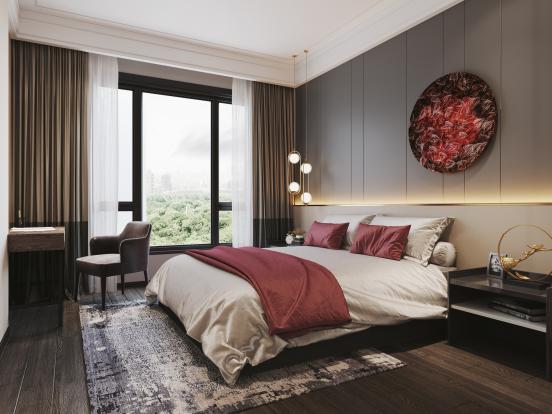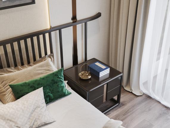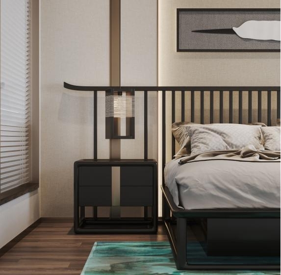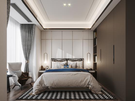 這幾間臥室無(wú)一例外都選擇了深色地板,顯然棕木地板和中式風(fēng)格的適配性是很好的,能顯現(xiàn)出中式審美中的質(zhì)感與品位。雖然都運(yùn)用了明顯的中式元素,但我們?nèi)匀荒芨杏X(jué)到,在床、衣柜、墻面、燈具的造型和形狀上是以現(xiàn)代審美為主的,這樣既能帶給我們中式含蓄的美感,又不影響平常的正常生活。