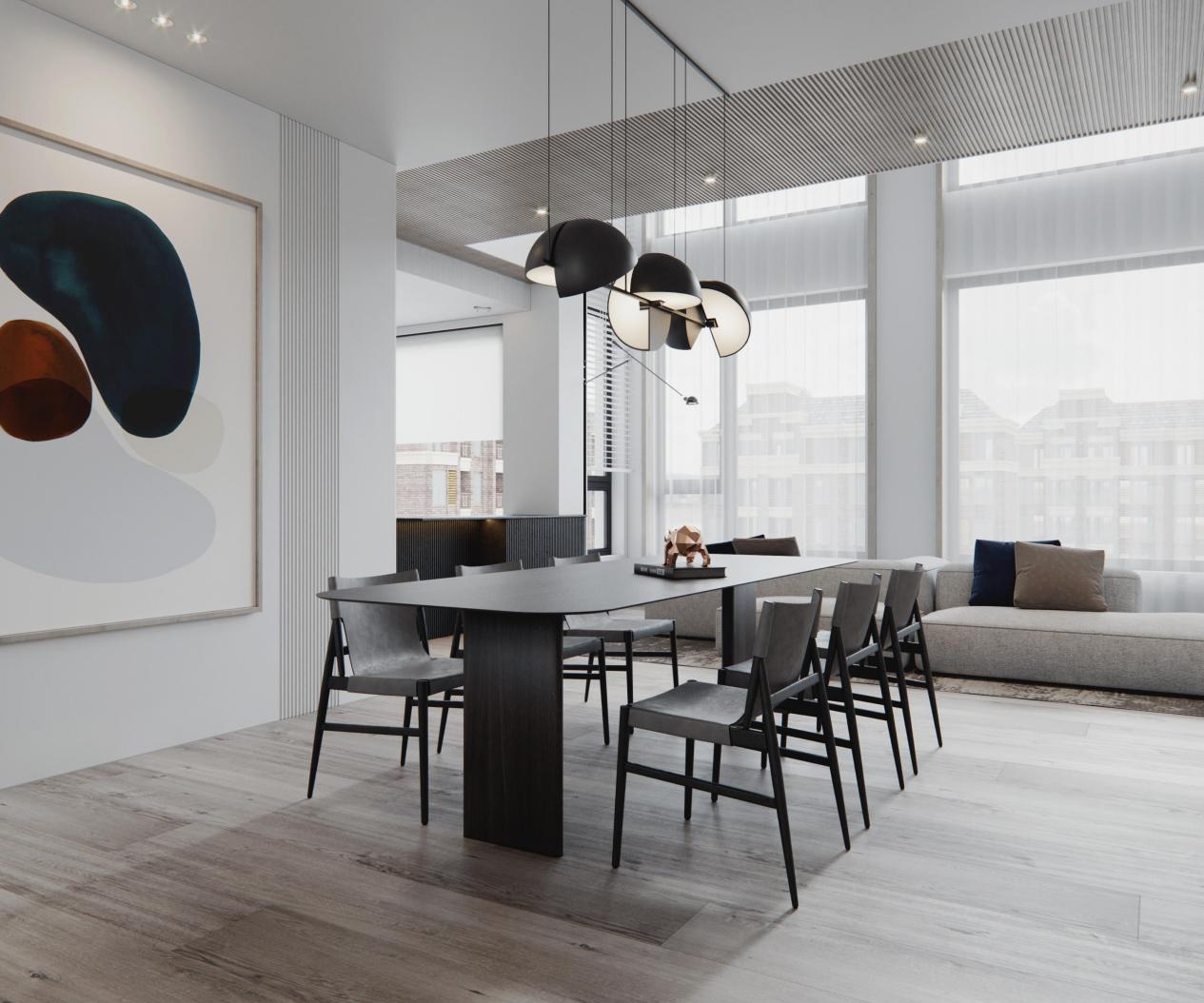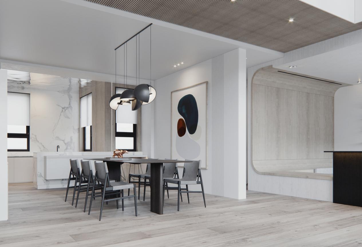 餐廳簡約的餐桌兩邊擺放著舒適的餐椅,墻面用一幅寫意的畫作進(jìn)行裝飾,設(shè)計巧妙的吊燈懸掛在餐桌之上。