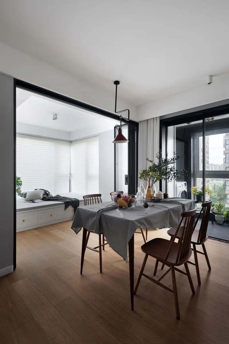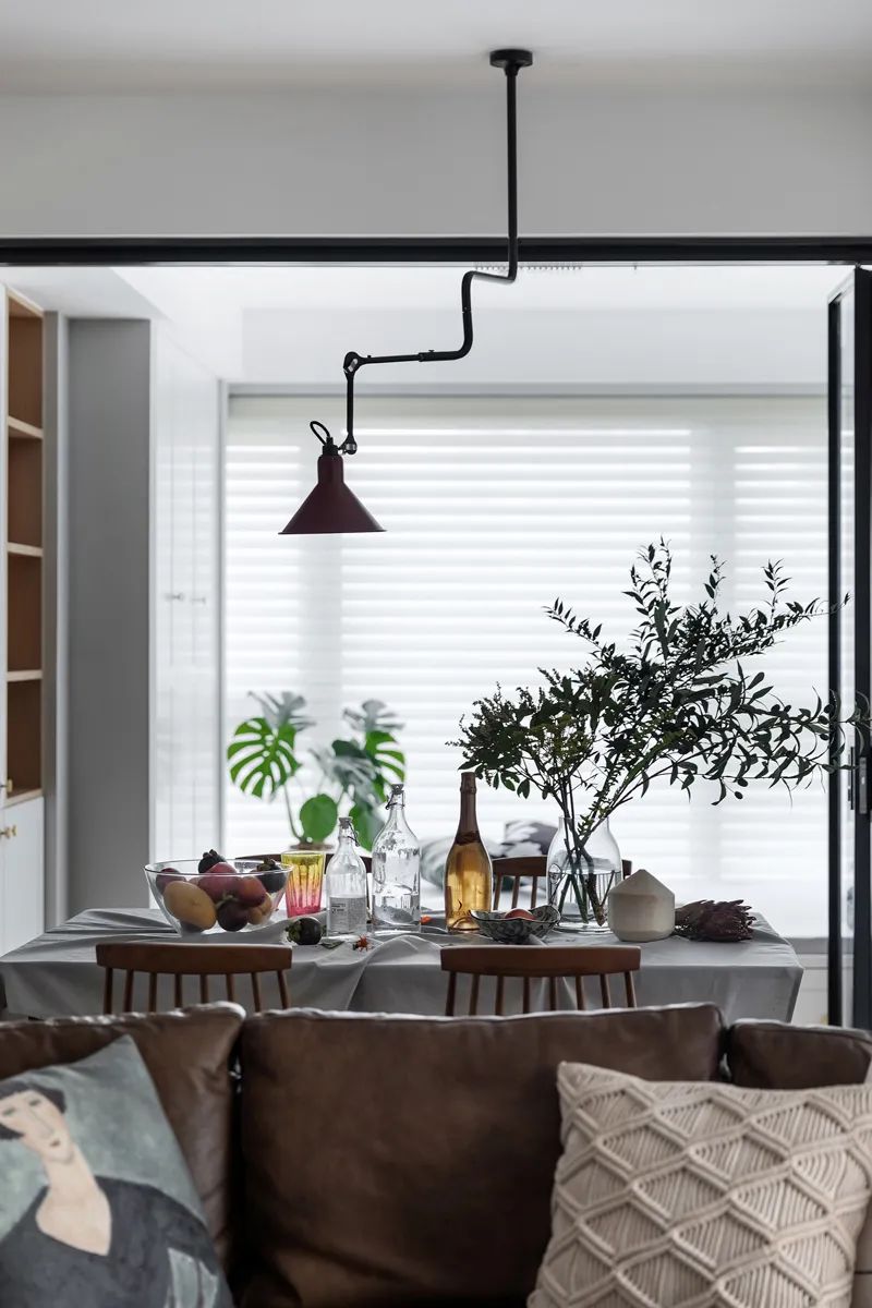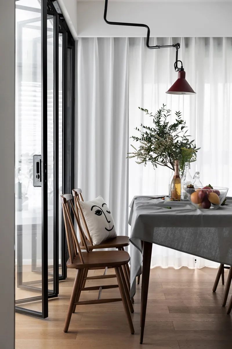 餐廳燈飾用幾何造型表達(dá)出具有個(gè)性的藝術(shù)美感,櫻桃紅的燈罩時(shí)尚小眾,木結(jié)構(gòu)餐桌文藝范十足,能依靠不同桌布展現(xiàn)不同韻味,只需擺放上綠植與水果,詩意與煙火氣就得以豐盈環(huán)境,向暖而居。