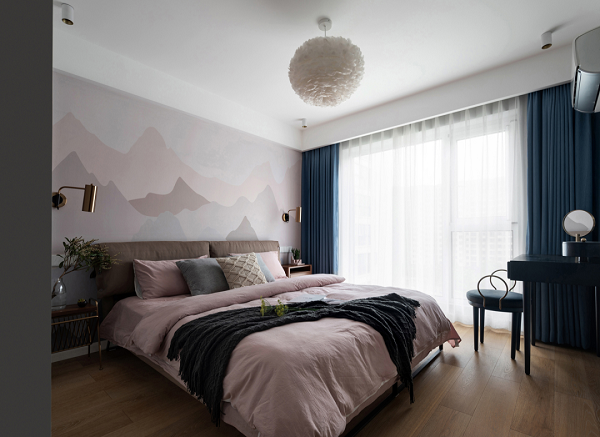 臥室色調(diào)大膽采用莫蘭迪低飽和度暖色系,演繹甜而不膩的印象,背景墻暈開不同色素,讓朦朧之感蔓延,烘托出溫柔的藝術(shù)氛圍,為女屋主每一次休憩與梳妝帶來恬然心動(dòng)。