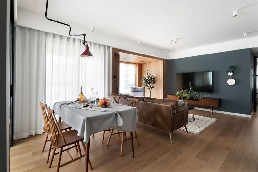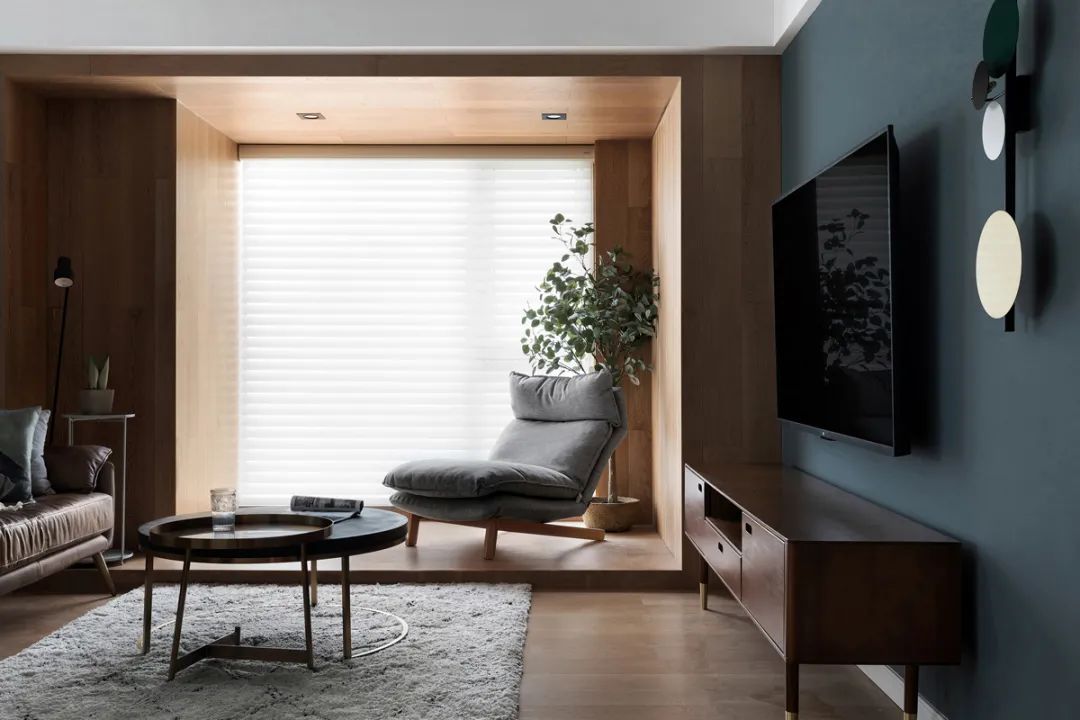 電視背景墻將藍(lán)綠色調(diào)參與在白與木的主調(diào)之中,一半個(gè)性,一半兼容,升華著空間層次,讓視網(wǎng)膜能在平靜之境中感受到一處新趣,心臟也因此被隨脈搏引發(fā)心動(dòng)。