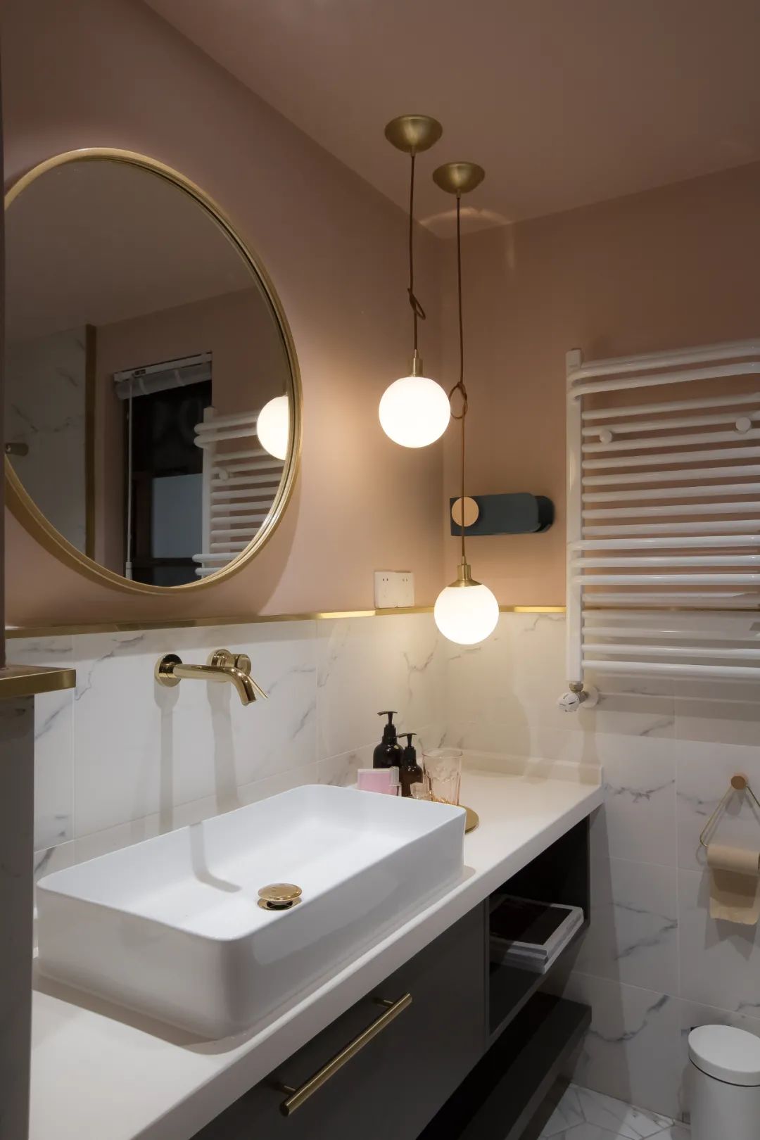 ◎ 衛(wèi)浴間吊頂自上而下垂下兩顆吊燈,纖細的線桿搭配黃銅材質(zhì)時尚而精致,暖色調(diào)燈光與海藍背景發(fā)酵出另一份溫馨文雅的意境,讓晝?nèi)张c暮夜的格調(diào)各不相同。