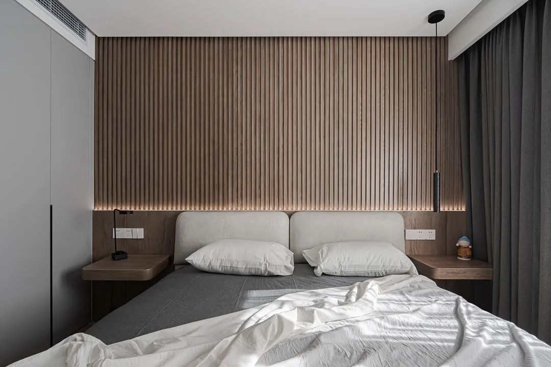 ◎主臥空間將奢與雅細(xì)致描摹,深邃木色線條背景墻在暗藏的光源烘托下流露動(dòng)態(tài)美感,典雅與大氣由內(nèi)向外滲透。