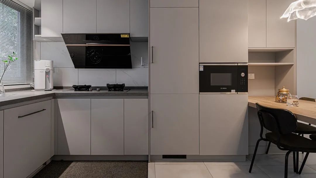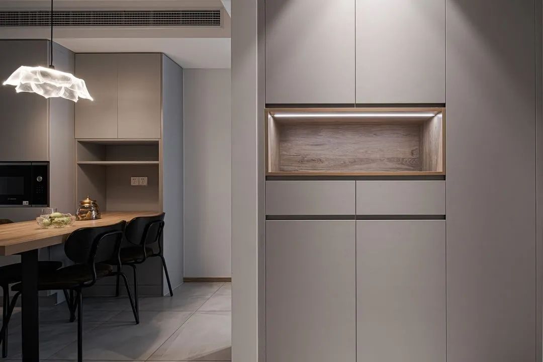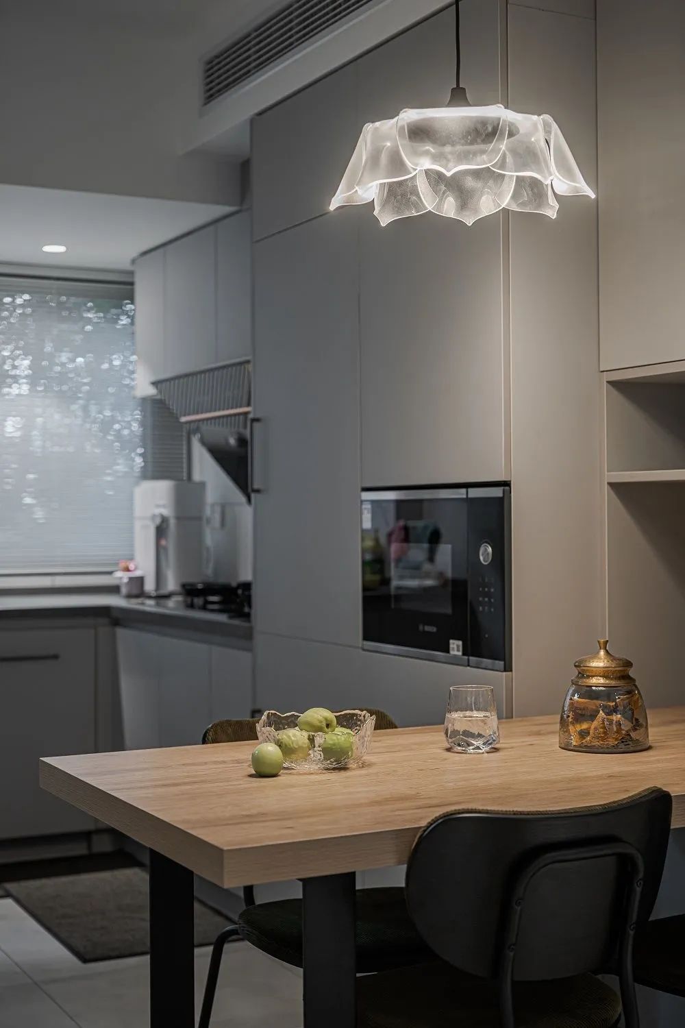 ◎墻面低飽和度灰色基調(diào)在克制中釋放高級(jí)感,原木材質(zhì)平衡其中作為收納柜與餐桌,讓含蓄內(nèi)斂的內(nèi)核多出幾分柔美與溫馨。