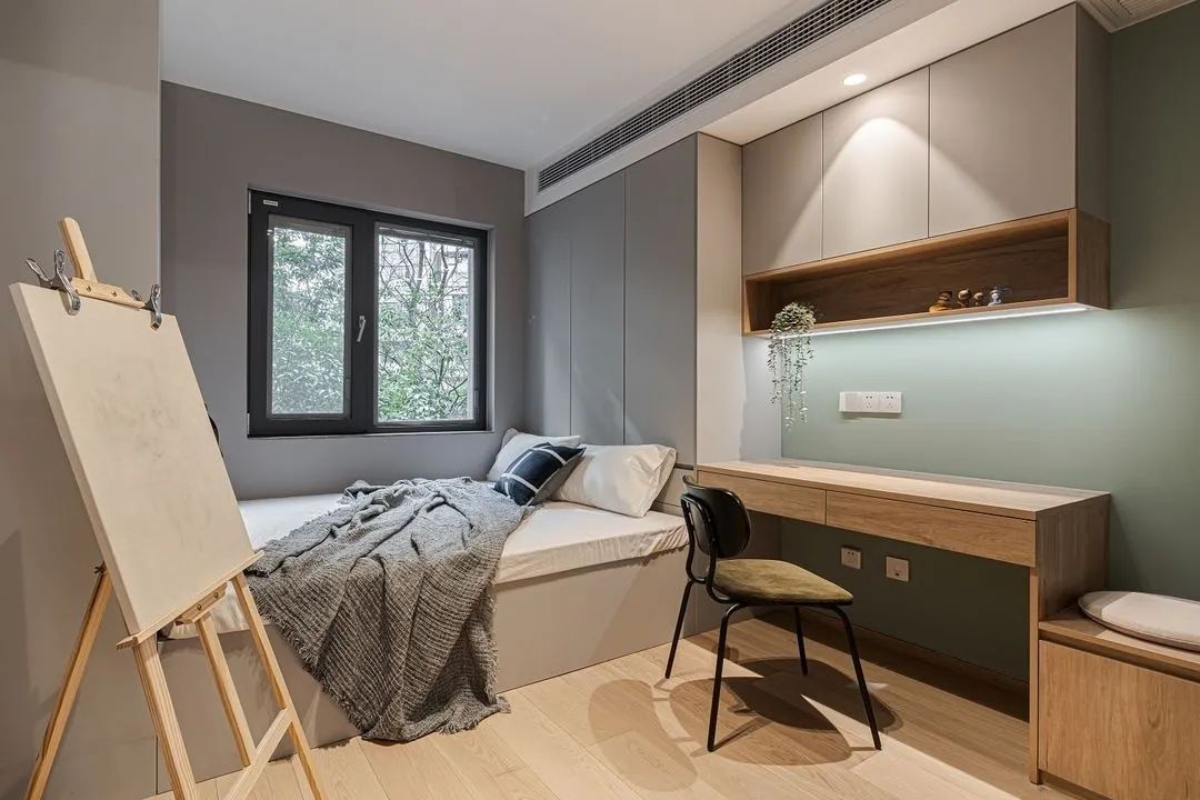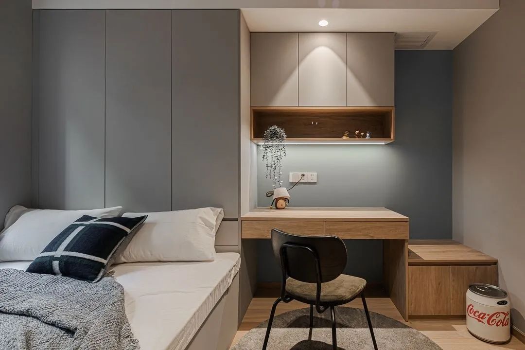 側(cè)臥作為孩子房,功能也一應(yīng)俱全。挑高床位設(shè)計(jì),自然展現(xiàn)空間立體感,拉伸出視覺寬度?;疑{(diào)背景墻與原木系保持關(guān)聯(lián)互動(dòng),書桌迎合著收納柜與內(nèi)嵌式燈源,將溫馨感淋漓盡致。