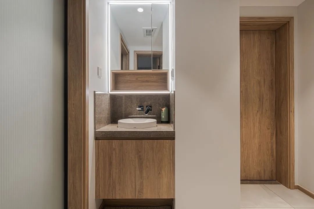 ◎大面積留白讓空間呈現(xiàn)出素雅整潔,自然大方的腔調(diào)。有克制的注入原木材質(zhì)于留白中,予人視覺感官層次美感。將傳統(tǒng)與現(xiàn)代雙軌并行,由簡約材質(zhì)平面鏡,大理石,光條等構(gòu)建出蘊(yùn)含東方美學(xué)的藝術(shù)姿態(tài)。