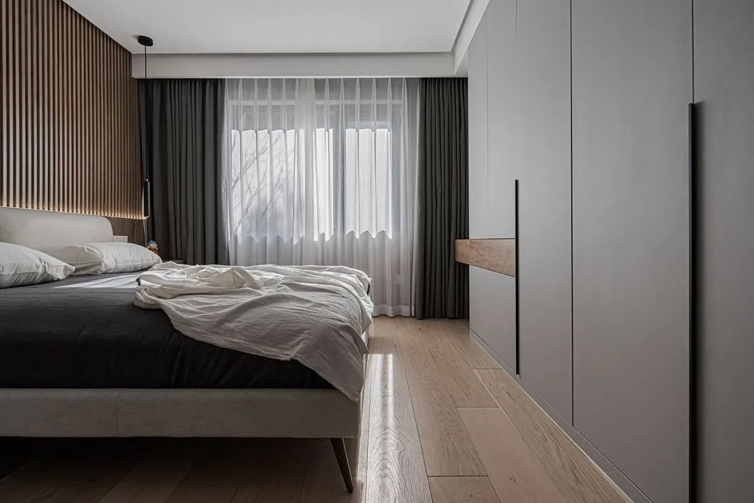 ◎灰色調(diào)收納墻表面質(zhì)感細(xì)膩,將藝術(shù)美感展現(xiàn)在外。在與木地板相輝相映中蘊(yùn)藏的"紳士"魅力也悄然綻放。墻面向內(nèi)則是豐富的收納功能,亦是保證臥室整潔通透的重要因素。