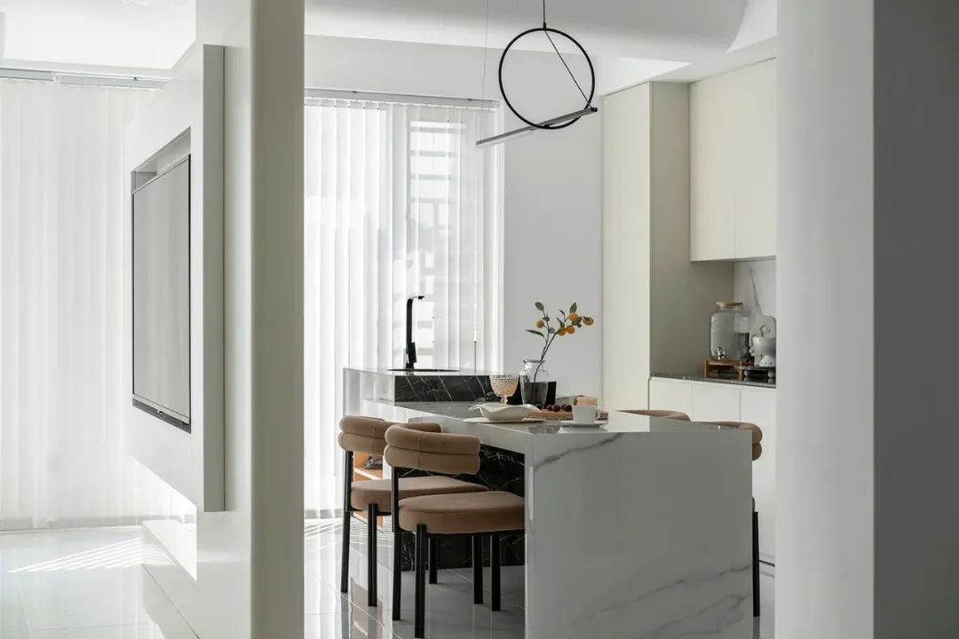 ◎ 入戶玄關似邁入素凈明朗之境,四周留白摻揉灰色調將高級感細致描摹,用弧度代替平仄分明的線與角,在柔緩曲線中將視野放大,迎合陽臺涌入的陽光,自然感與舒適感自然躍然紙上。