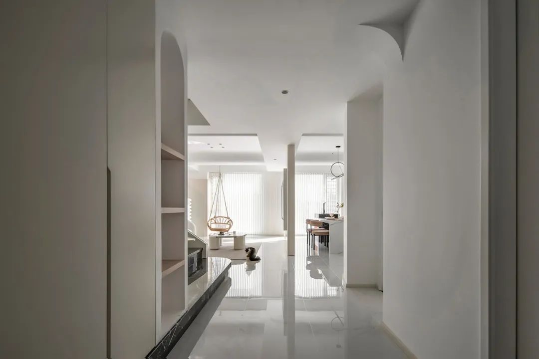 ◎ 色調上依舊將奶茶色與奶油白貫穿始終,地板光滑質感承載墻面細膩肌理,光線流動碰撞出時光靜好之情。