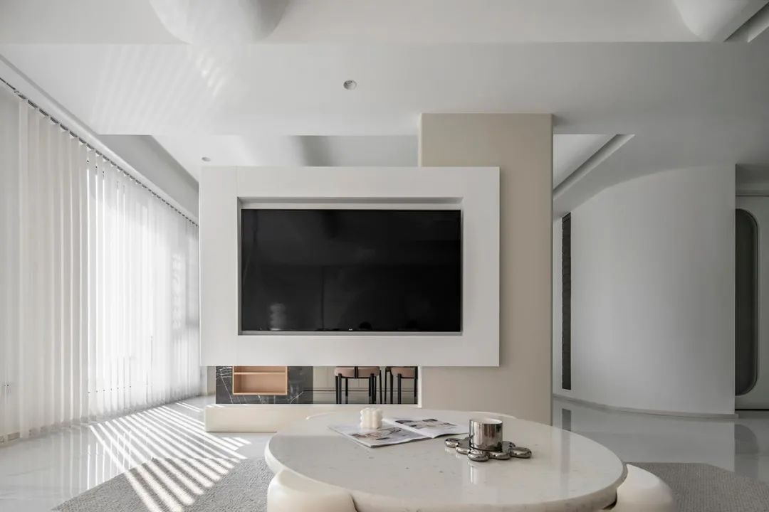 ◎ The sitting room in the white space curve carry floating milk tea color background wall to enhance stereo feeling, modern creamy white cloth art sofa radian nature.