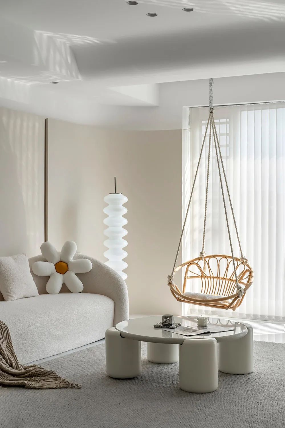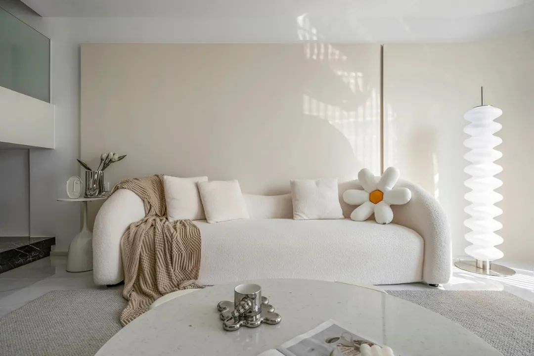 ◎ 客廳在曲線留白中鐫刻舒緩印象,沙發(fā)背景墻采用挑浮奶以增強立體感與層次感,現(xiàn)代奶油白布藝沙發(fā)弧度自然,契合整體空間基調烘托出甜美舒緩的氛圍。