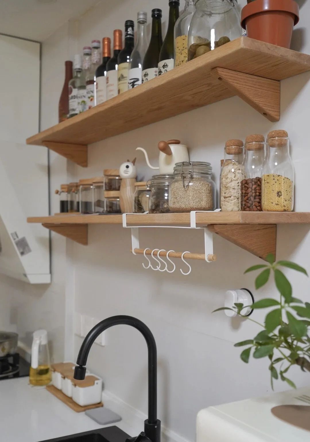 小空間小擔(dān)心做吊柜會壓抑,可以選擇了一字隔板,一層放滿調(diào)料罐,用來放酒瓶,閑暇之余,一起開心的喝起來!