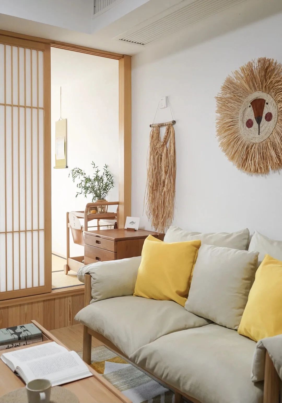 日式客廳,不能安排得太滿,留出足夠的動線空間,行動更自由。在選擇配色上,柔軟且飽和度的顏色會顯得空間更輕盈,所以選擇米白和原木色為主,一來是可以提升客廳的視覺通透感,二來也會讓原木色變得溫潤。