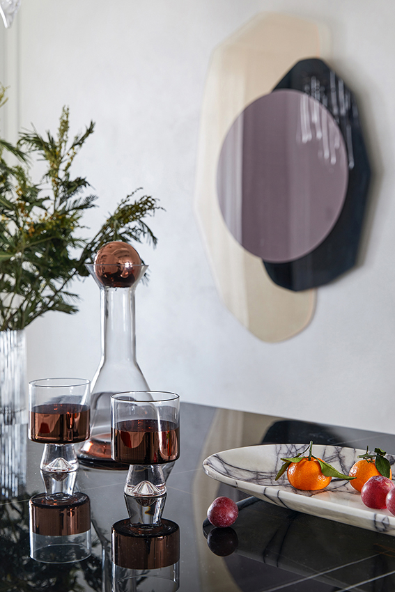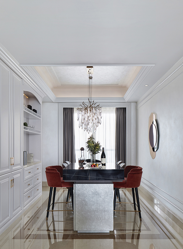 餐廳設(shè)計(jì)是以吧臺(tái)加餐桌的形式組合,亞克力、實(shí)木和大理石的拼接,顯得質(zhì)感十足。樹(shù)枝水晶吊燈光影錯(cuò)落,讓用餐儀式感滿滿。