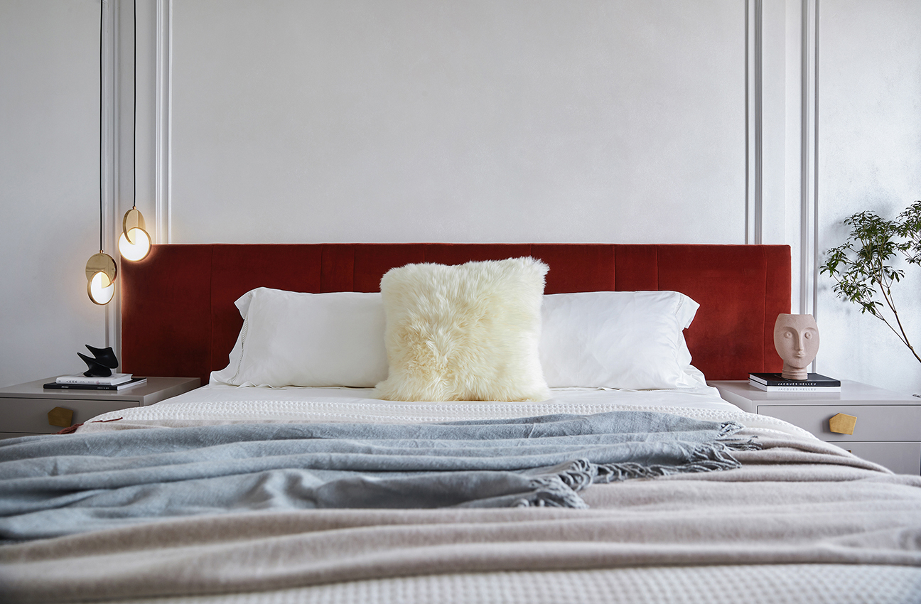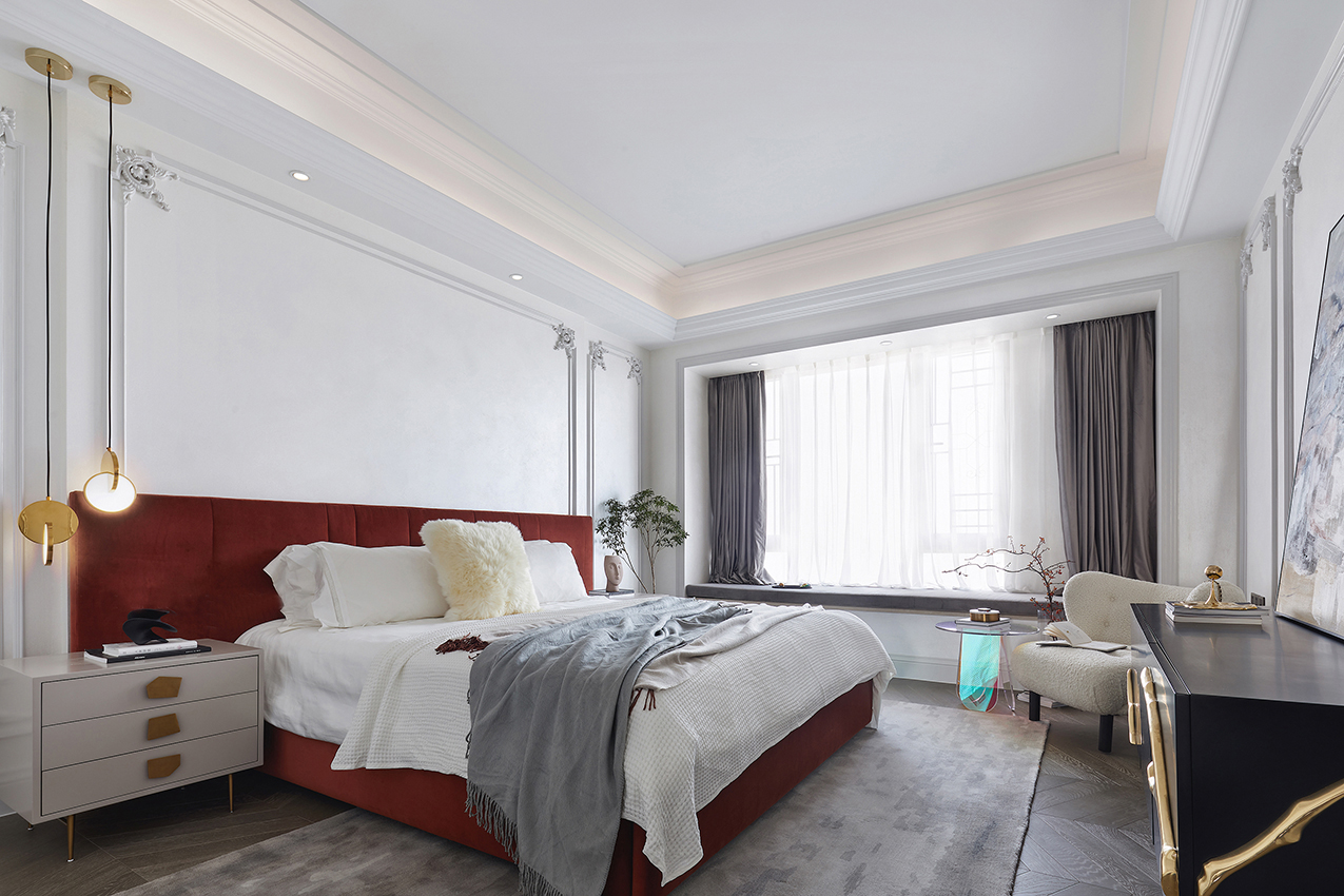 臥室延續(xù)了客廳的暖白色,優(yōu)雅簡(jiǎn)約的雕畫(huà)線條,顯得浪漫由優(yōu)雅。燈光上摒棄了中心吊燈的形式,采用現(xiàn)代無(wú)主燈設(shè)計(jì),增加了臥室的氛圍感。