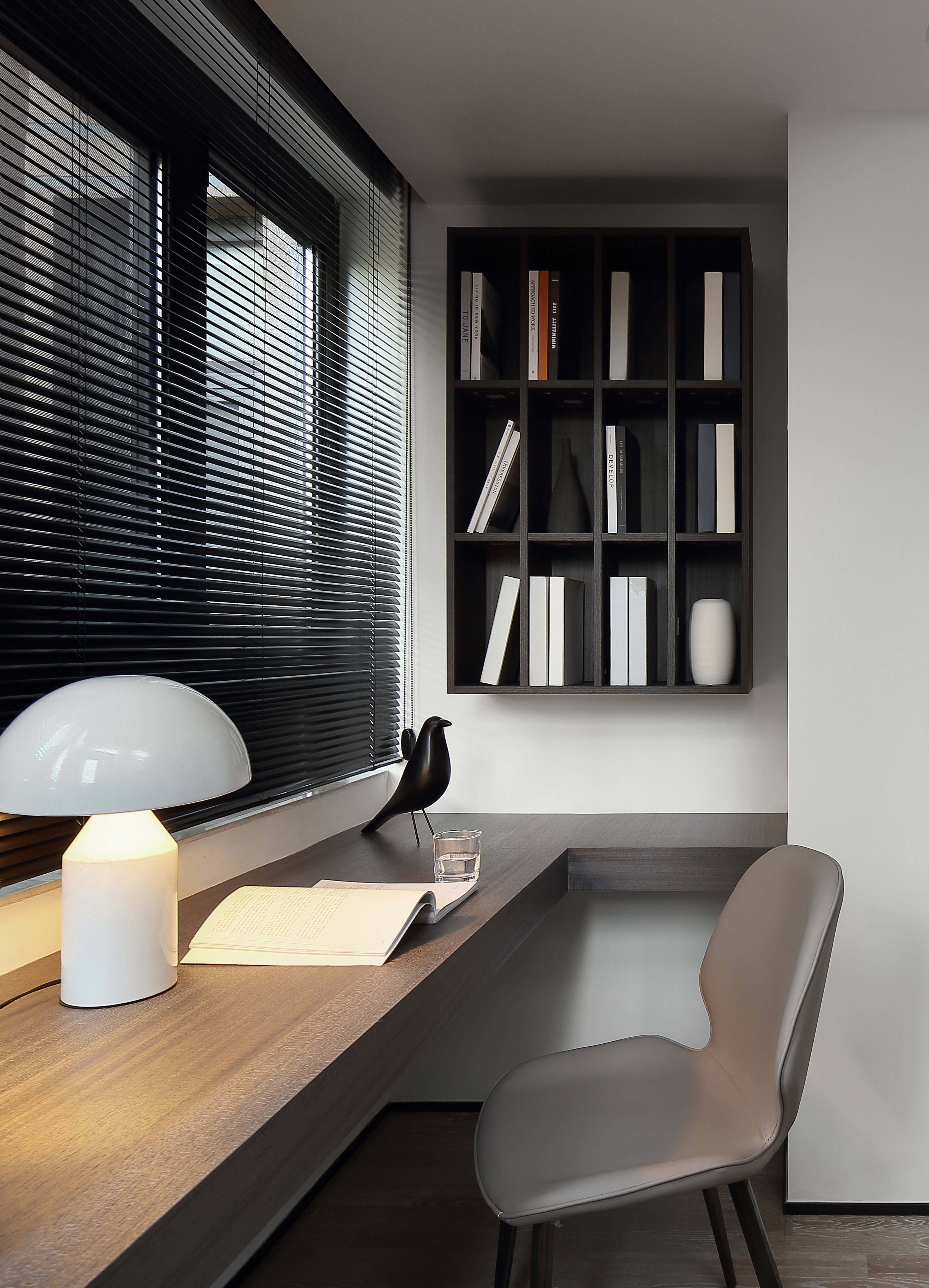 書房不僅能夠提供一個安靜舒適的工作環(huán)境,更是彰顯個人生活態(tài)度的地方。靠窗定制超長原木色系書桌,靠墻打造懸空書架,放置書本文件,高級感滿滿。