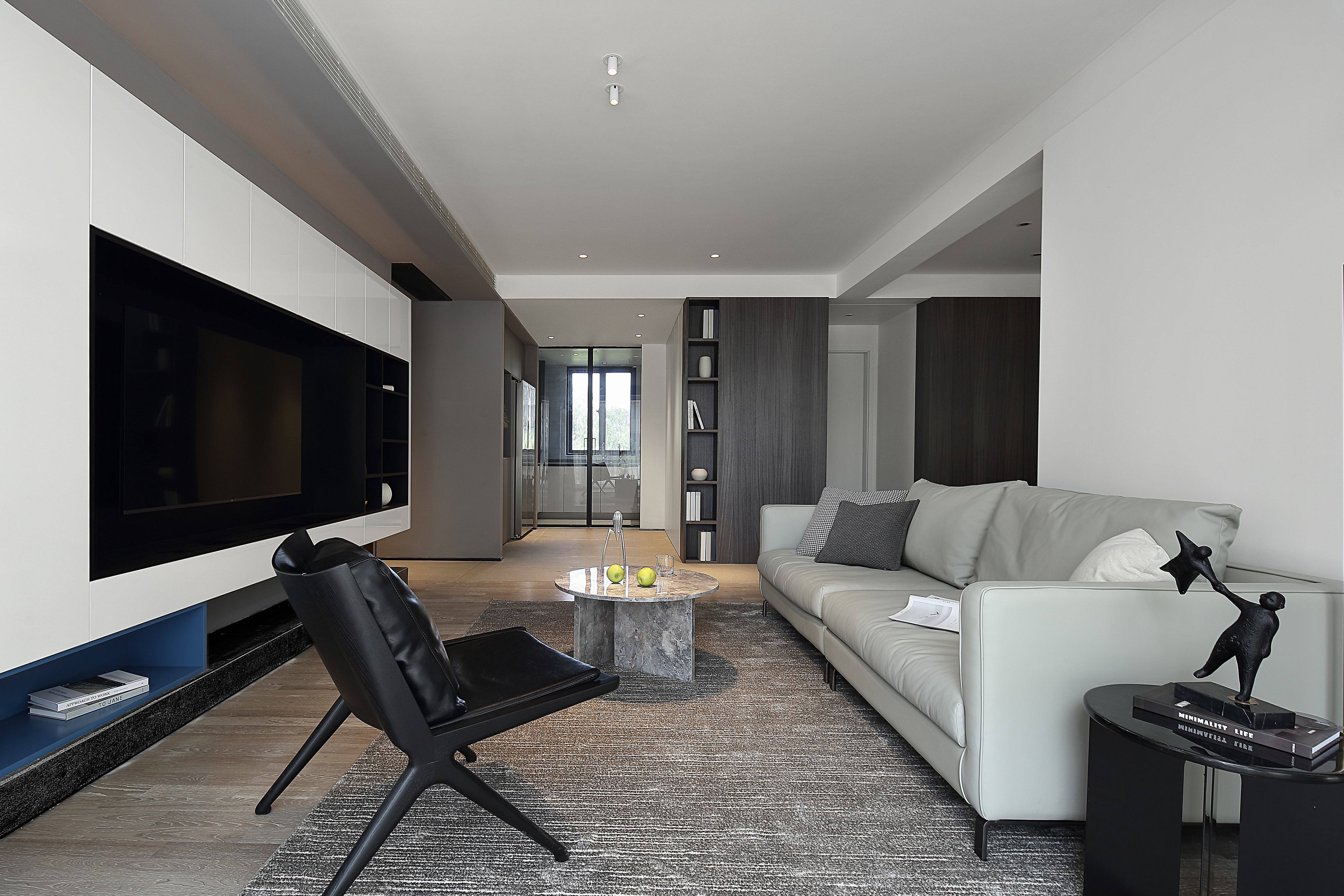 電視墻做了整排的儲物柜,增加空間收納實用性。白色的運用,讓整個空間不會顯得過分壓抑。矮背皮質(zhì)沙發(fā)凸顯質(zhì)感。無主燈的設(shè)計,讓空間視覺顯大。搭配燈帶,營造出溫馨氛圍感。