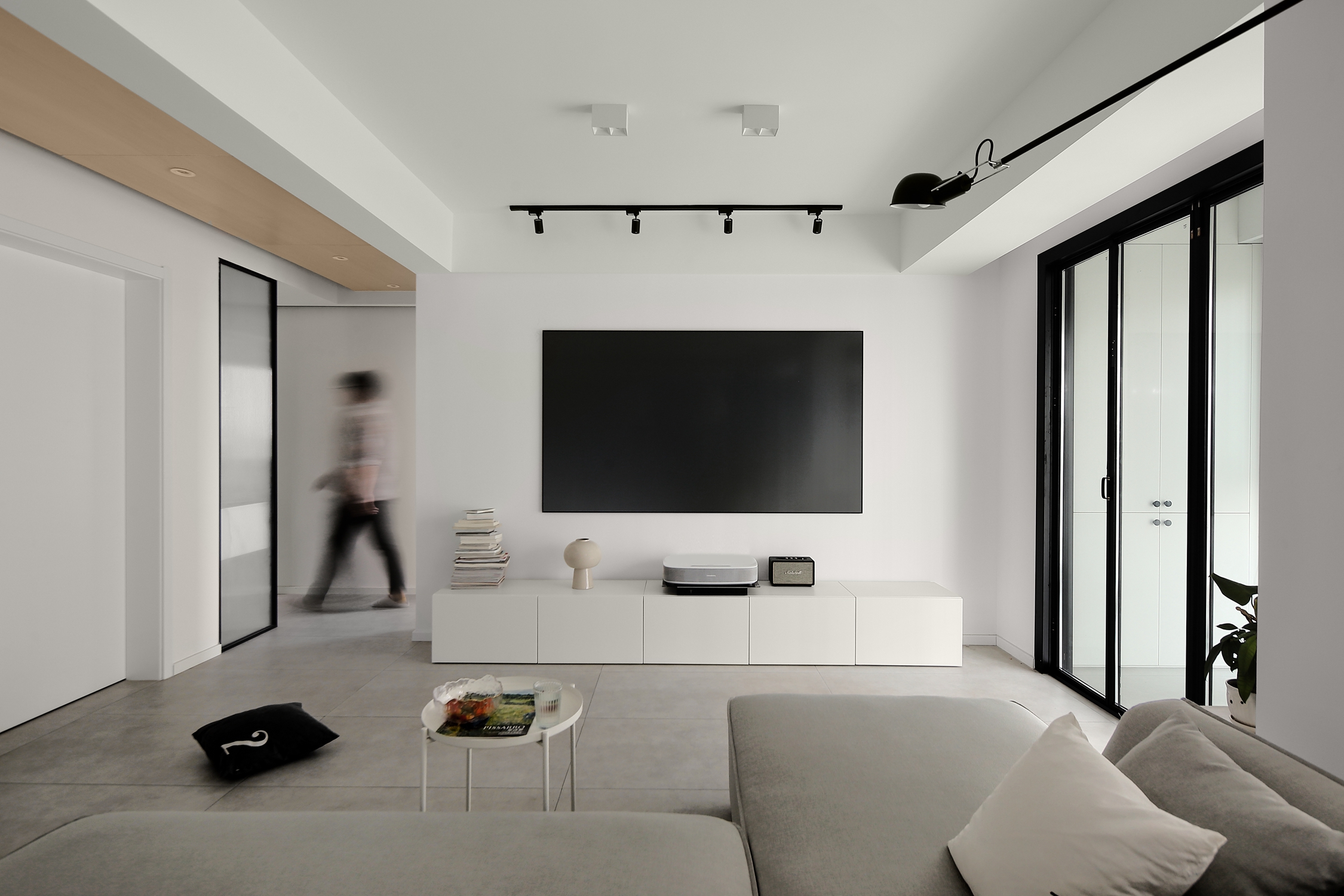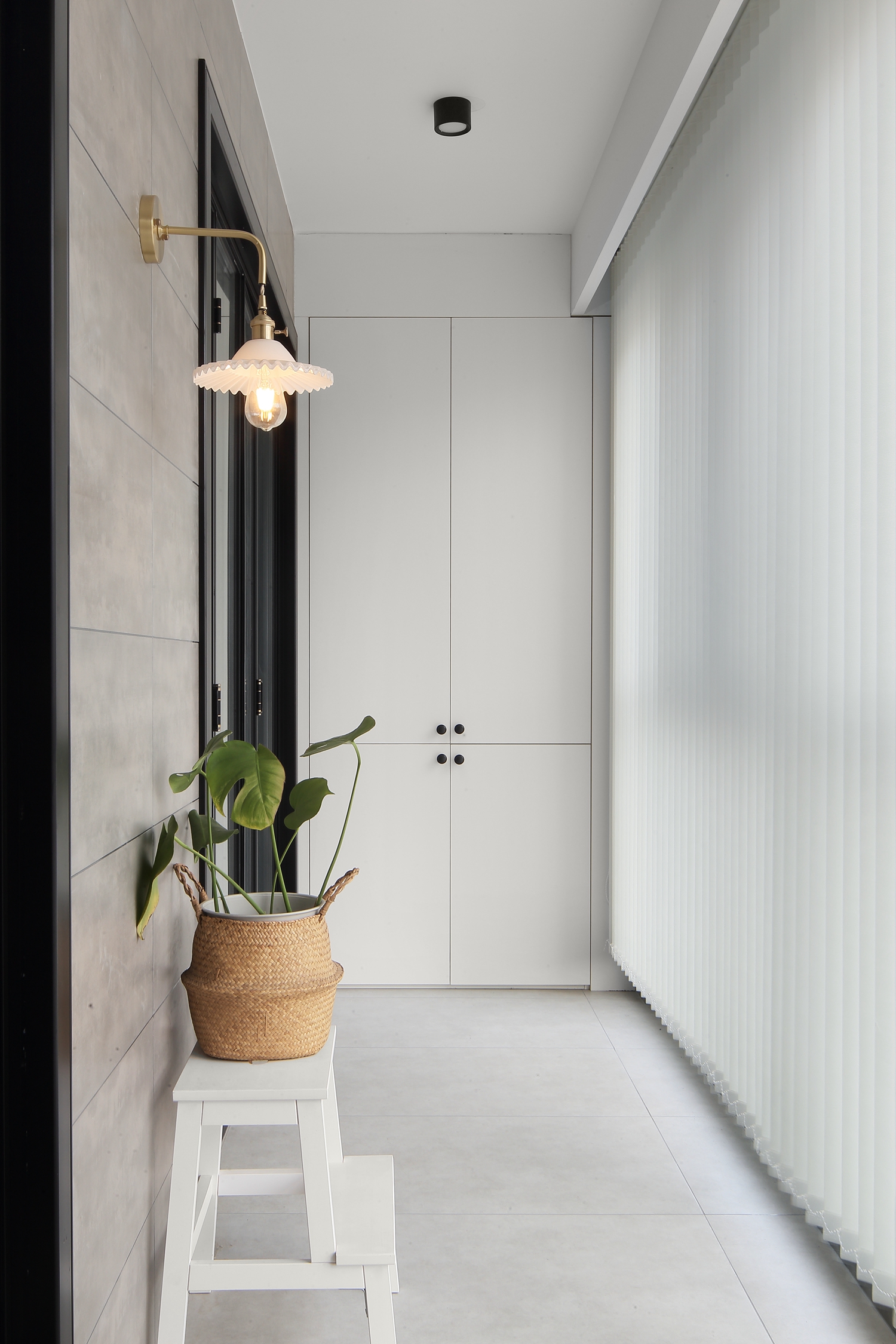 客廳雙陽(yáng)臺(tái)貫通,打造休閑出一個(gè)休閑區(qū),作為看書、喝茶、聊天的區(qū)域。陽(yáng)臺(tái)的收納也沒(méi)有落下,一邊靠墻打造收納柜,一邊安裝洗烘套裝。放棄了傳統(tǒng)頂面晾衣的模式,讓整個(gè)空間都顯得干凈整潔。