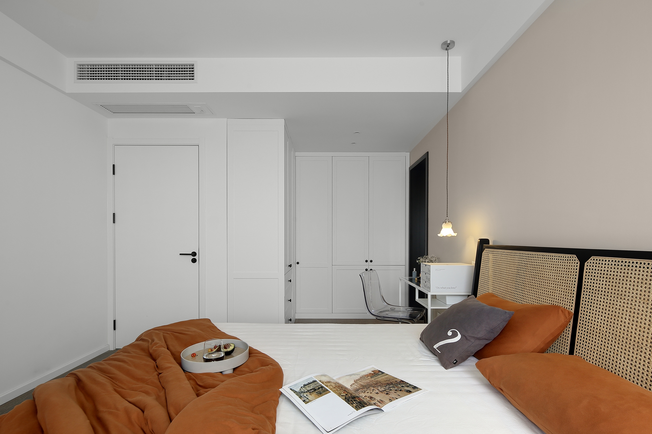 主臥背景墻刷的可可糖,讓臥室整體色調(diào)變得溫馨起來(lái)。藤編的家具加上百葉窗,不禁讓人回想起童年的美好感覺(jué)。L型的衣帽間滿足了主臥的收納需求,大量的掛區(qū)加少量的抽屜,減少了疊衣服的繁瑣。主衛(wèi)采用半墻瓷磚鋪貼半墻防水乳膠漆涂刷,讓空間更顯層次感。