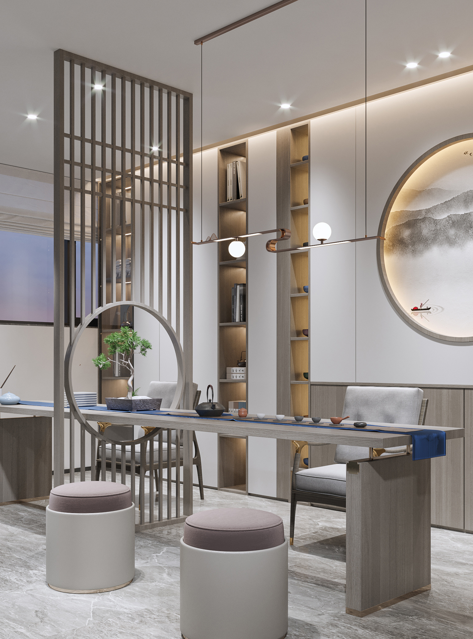 茶桌是新中式風(fēng)格中不可或缺的元素之一。茶桌除了實用性外,還可以彰顯主人的文化品位。在擺設(shè)方面,可以搭配“新中式”茶具或水墨畫作為點綴,打造出具有古典氣息和現(xiàn)代韻味的空間。