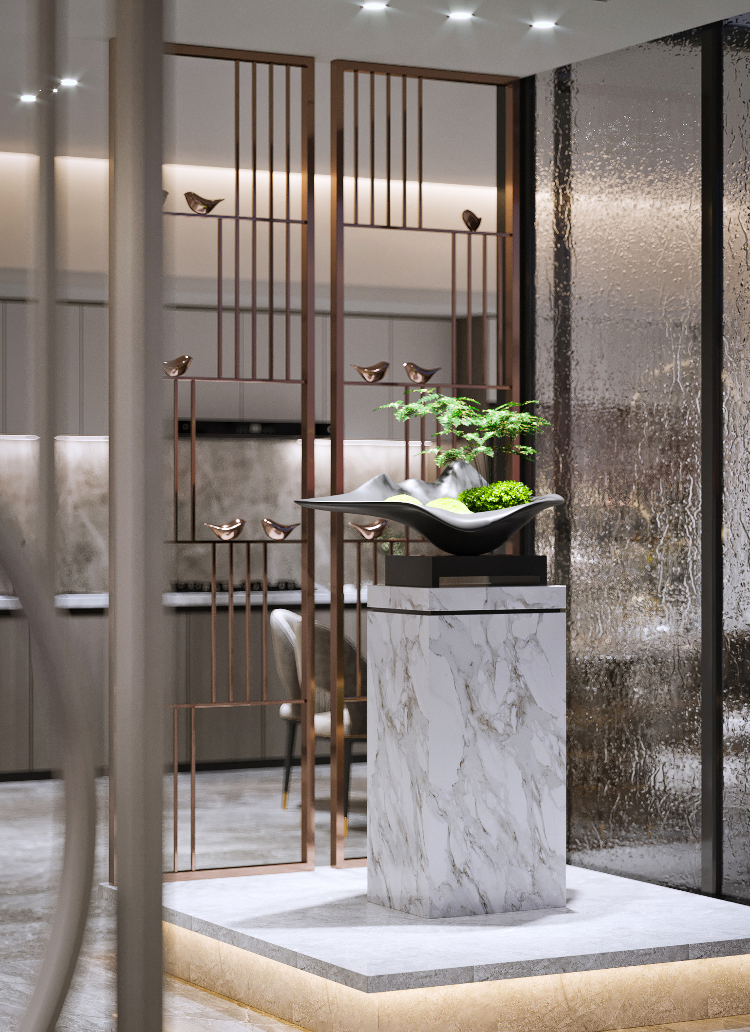 木質(zhì)屏風(fēng)作為空間區(qū)隔,設(shè)計既兼顧實用性又能很好地體現(xiàn)中式文化精髓。木質(zhì)屏風(fēng)的使用可以讓整個室內(nèi)空間更具有層次感,還能起到優(yōu)化布局的效果。