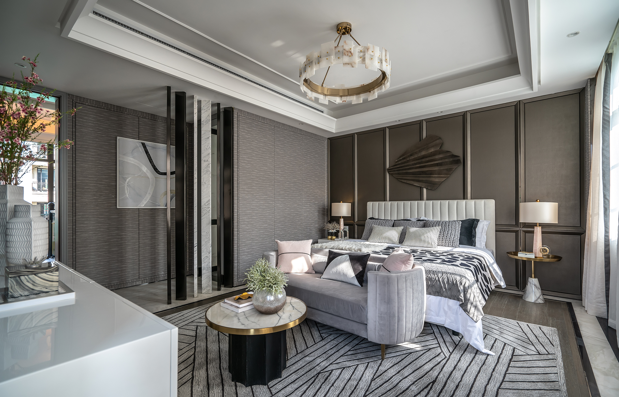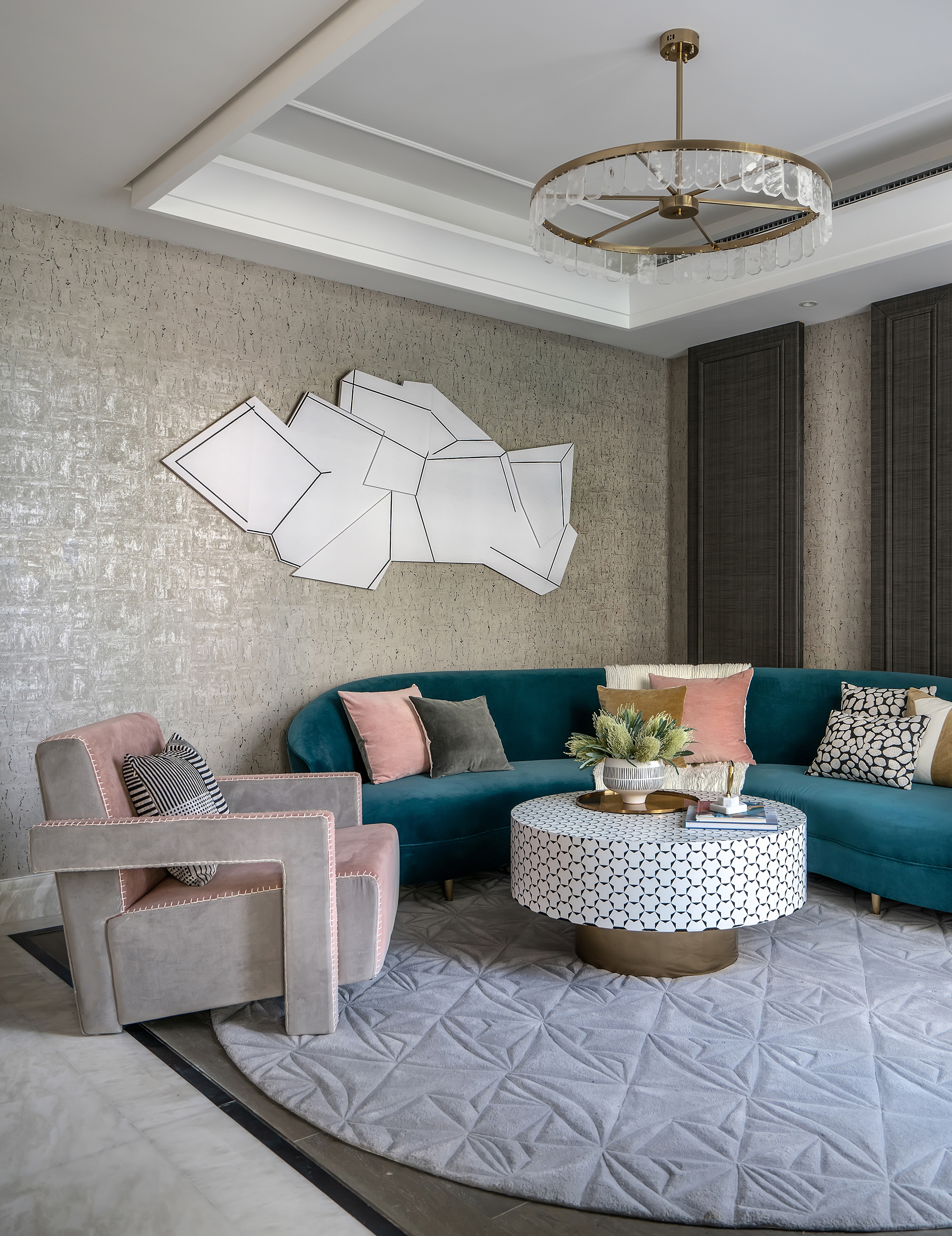 在別墅中,我引入了大量的幾何元素裝飾,例如在地毯、茶幾、背景墻和裝飾畫(huà)等方面都運(yùn)用了幾何元素,這樣能夠讓整個(gè)空間更加現(xiàn)代化、時(shí)尚化和藝術(shù)化。