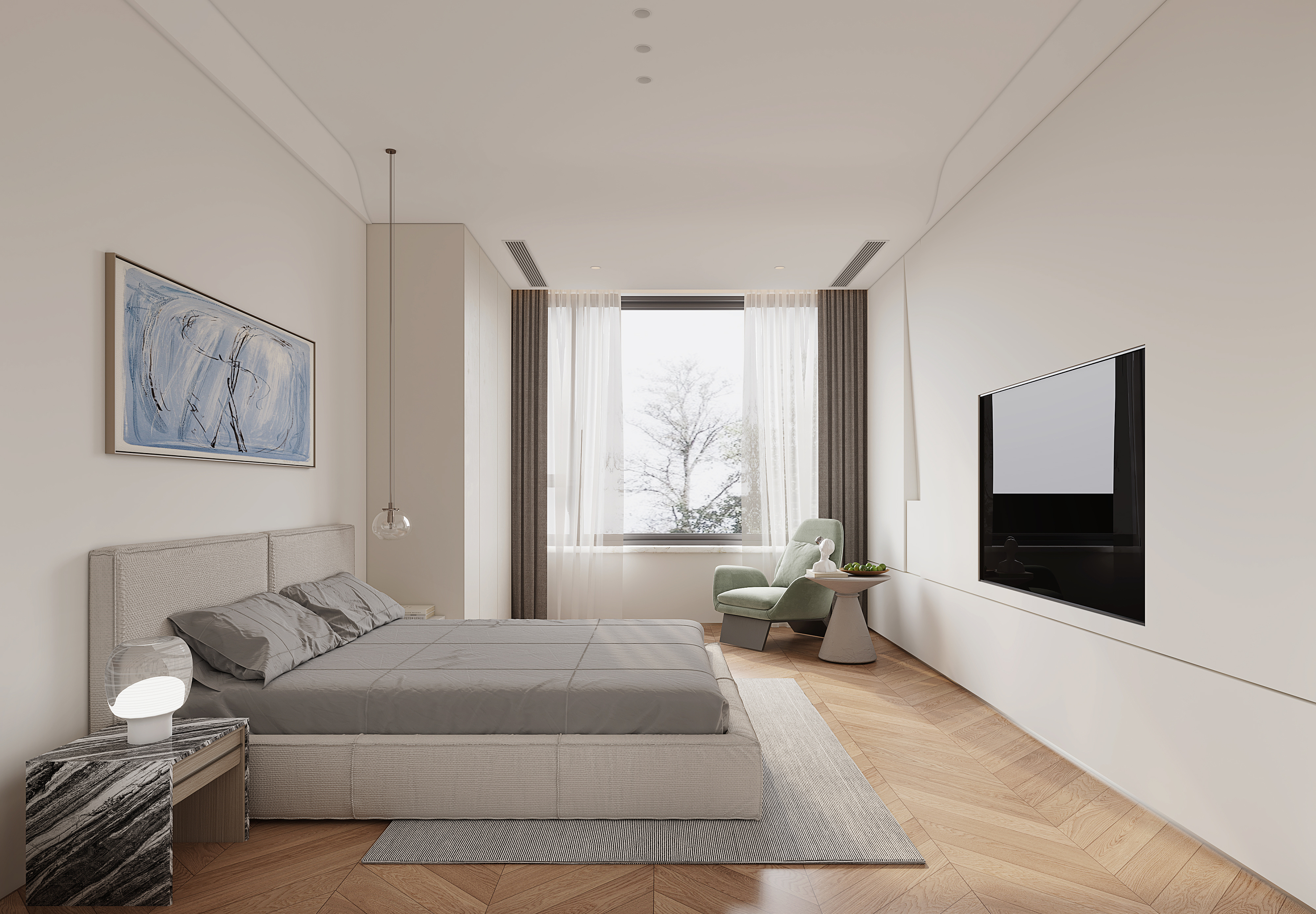 臥室是家居生活中最為私人化的空間之一,因此在奶油風(fēng)裝修風(fēng)格中,臥室地板往往采用魚(yú)骨拼木地板。這種地板可以讓臥室看起來(lái)更加優(yōu)雅和大氣,同時(shí)給人一種非常舒適的感覺(jué)。