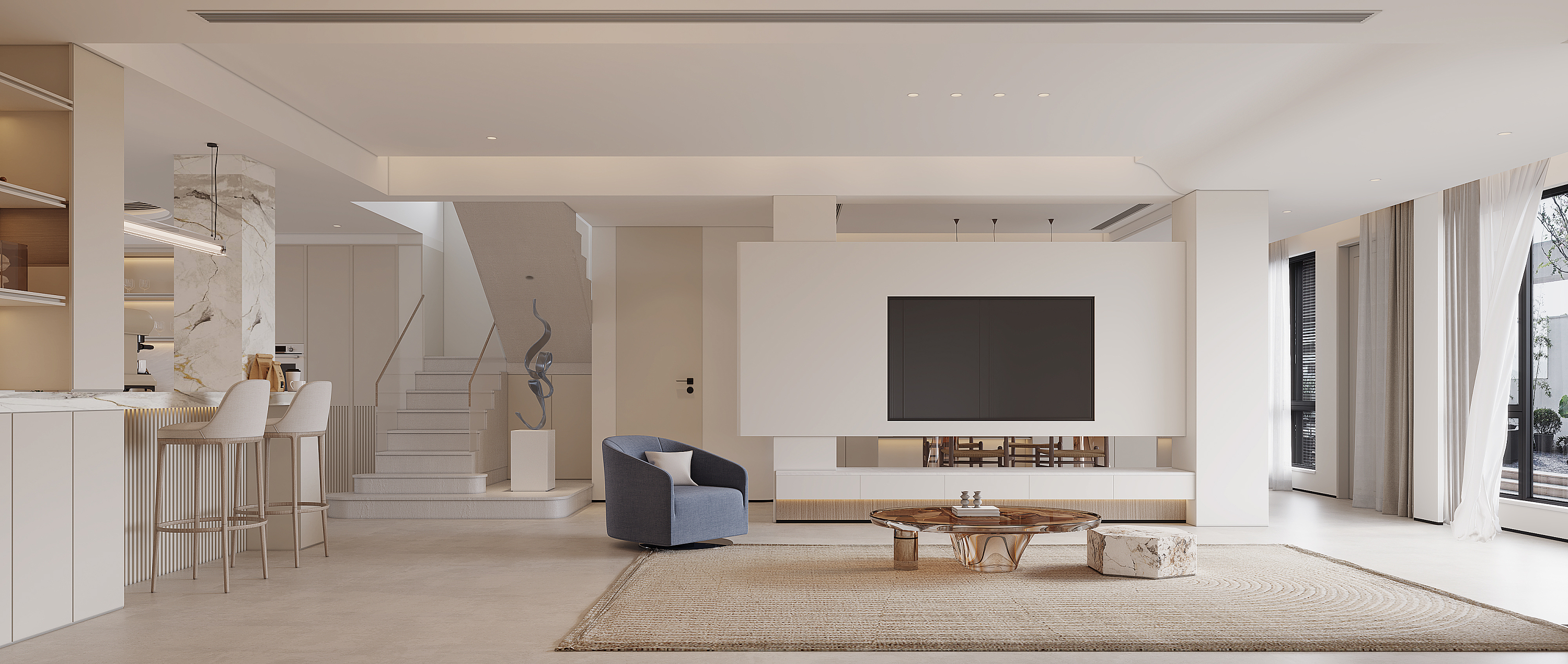 全屋采用暖白色系為基調(diào),營(yíng)造出整個(gè)家居空間明亮、溫暖的感覺(jué)。同時(shí),不經(jīng)意間出現(xiàn)的藍(lán)色家具,讓整個(gè)空間更有亮點(diǎn),增添一份清新的氣息。